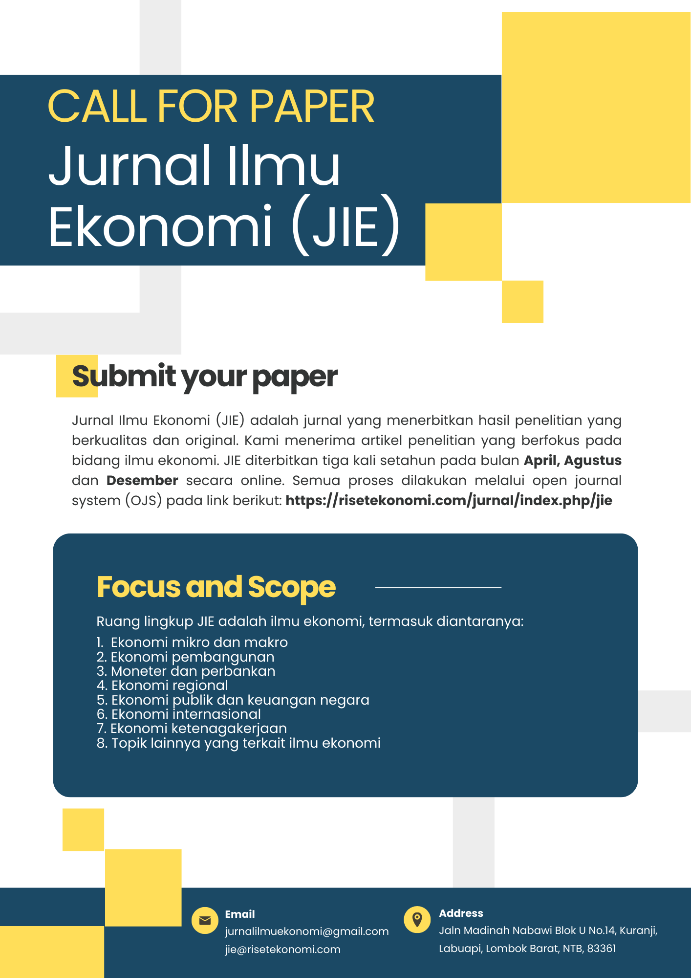 Jurnal Ilmu Ekonomi (JIE) diterbitkan tiga kali setahun pada bulan April, Agustus dan Desember secara online. Semua proses di JIE menggunakan Online Journal System (OJS). Artikel yang dikirim ke JIE akan dilakukan proses review. Naskah yang dikirimkan dapat menggunakan Bahasa Indonesia atau Bahasa Inggris.